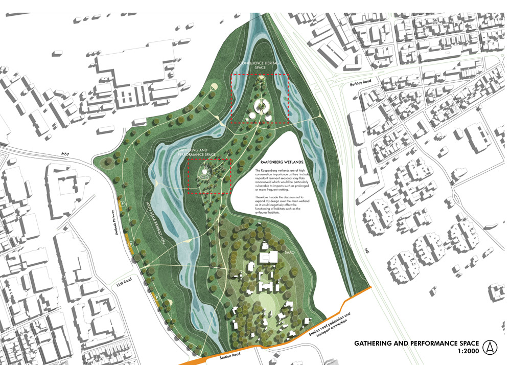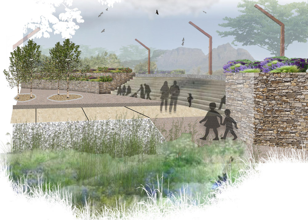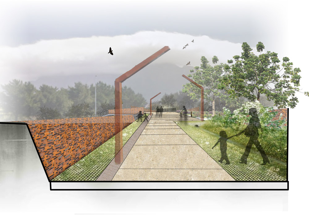 Kwezi’s project sheds light on the historic sensitivities within the Two Rivers Urban Park (TRUP) in Cape Town, focusing its design strategy mainly on the contested River Club site.